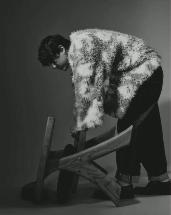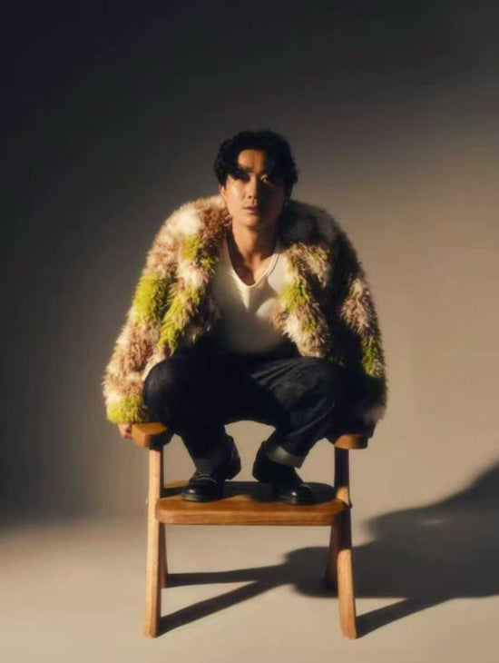 SAM LI WEARS HEURUEH FAUX FUR COAT IN GREEN FOR FLANELLE MAGAZINE