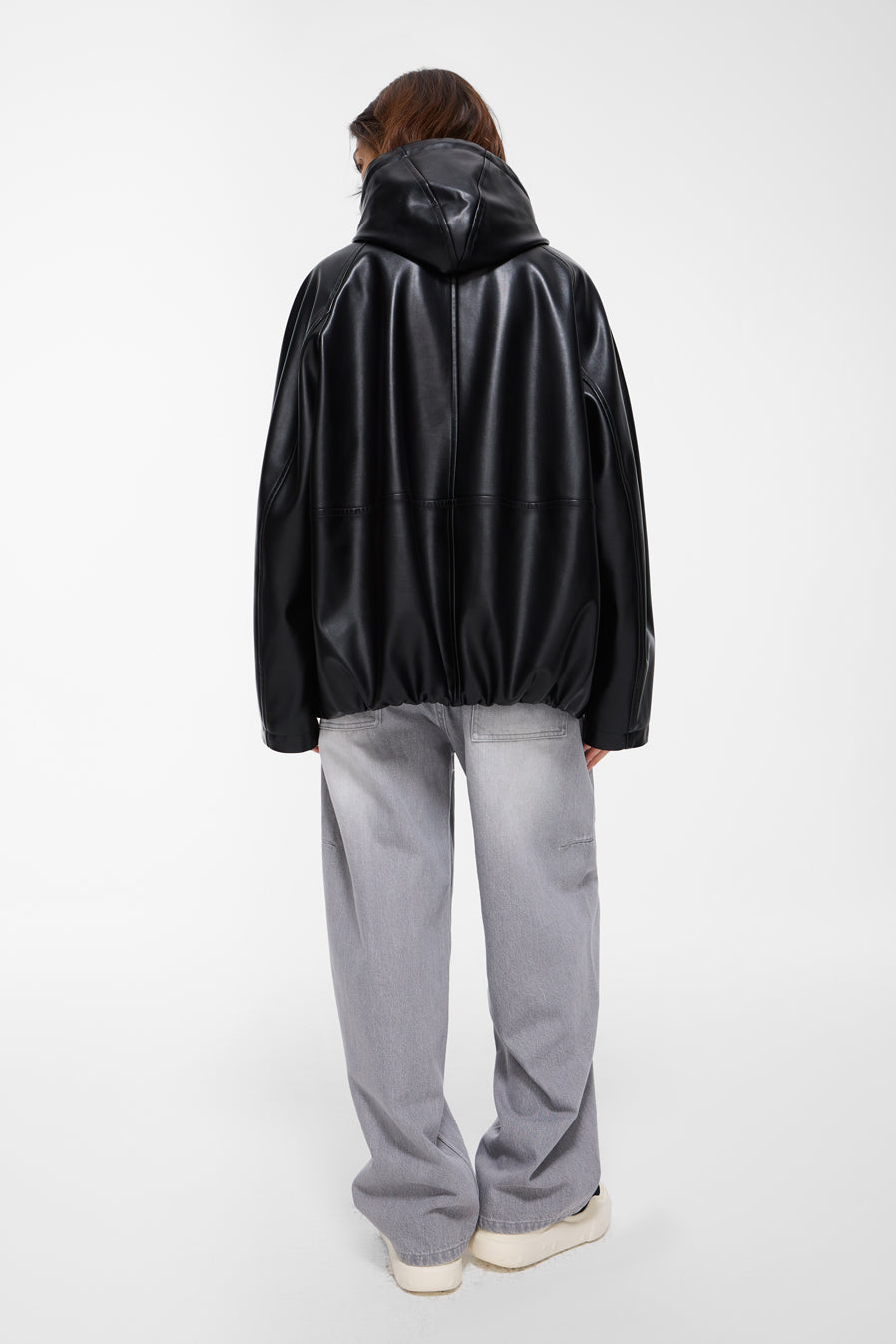 oversized fit faux leather hooded jacket front zip closure